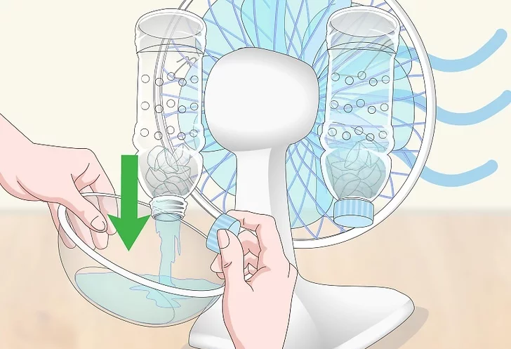 Buzları şişenin içine koyabilmek için şişenin altındaki kesiklerin ağızlarını açın. Şişeyi deliklerin altına kadar doldurun. Vantilatörü yüksek hıza ayarlayın ve soğutmak istediğiniz alana çevirin. Vantilatör, şişelerdeki soğuk havayı açtığınız deliklerden çekecektir. Şişeler vantilatöre bağlı olduğundan, vantilatörünün salınım özelliğini kullanabilirsiniz.